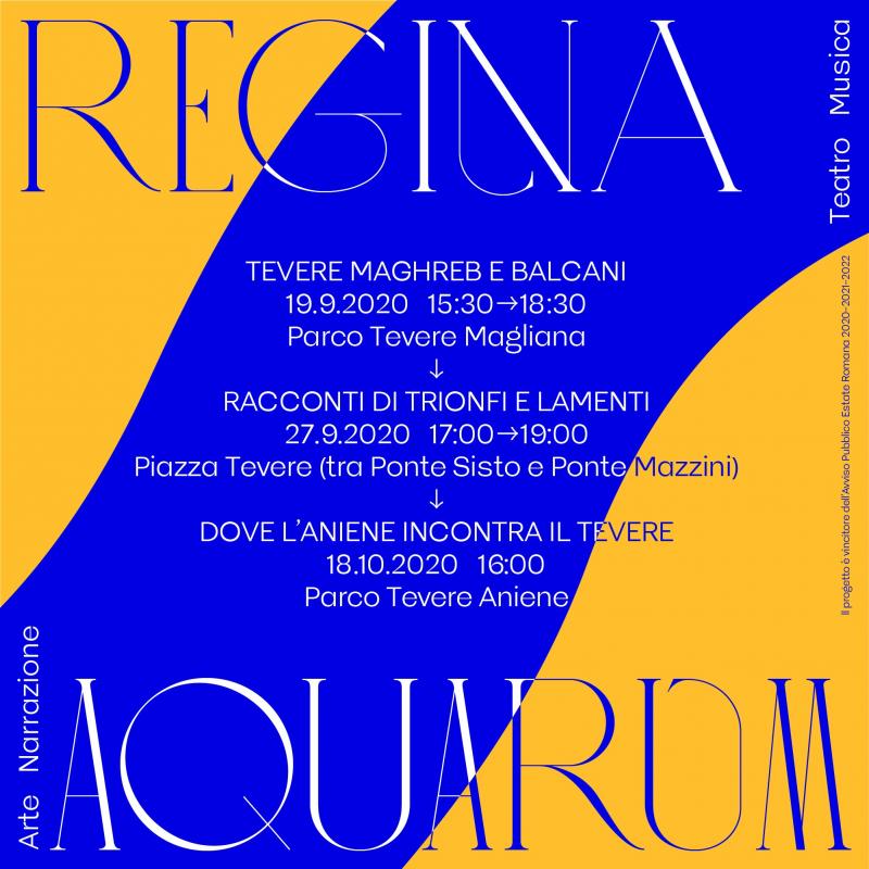 Regina Aquarum è il progetto triennale ideato dall’Associazione TEVERETERNO, presieduta dall’Architetto Luca Zevi, vincitore dell'Avviso Pubblico "Estate Romana 2020 – 2021 - 2022”, fa parte di ROMARAMA, il palinsesto culturale promosso da Roma Capitale, ed è realizzato in collaborazione con SIAE. In più di 10 anni di impegno e attività investiti nella valorizzazione del fiume Tevere, attraverso la realizzazione di eventi culturali incentrati sul rapporto tra spazio pubblico e arte site-specific, e culminati con l’opera “Triumphs e Laments” di William Kentridge a Piazza Tevere, TEVERTETERNO con il progetto Regina Aquarum ripropone le esperienze maturate in questi anni nella convinzione che l’arte sia l’indispensabile catalizzatore del rinnovamento urbano e della sua conoscenza da parte del pubblico. Arte, musica e teatro saranno dunque i protagonisti di questa stagione 2020/2021/2022 che vedranno coinvolti diversi ambiti urbani del Fiume, da Piazza Tevere al Parco di Tevere Magliana sino al Parco Valle dell’Aniene, connessi come luoghi privilegiati di coesione sociale e spazi di espressione di multiculturalità. “Per l’Estate Romana – dichiara Luca Zevi - Tevereterno propone un programma artistico e educativo originale e variegato: tre momenti per “pensare con i piedi” – passeggiate alla scoperta della città – e due performances musicali che, per la prima volta, “esportano” l’esperienza di Piazza Tevere lungo due tratti fluviali meno centrali, il Parco della Magliana a sud e il Parco dell’Aniene a nord”.