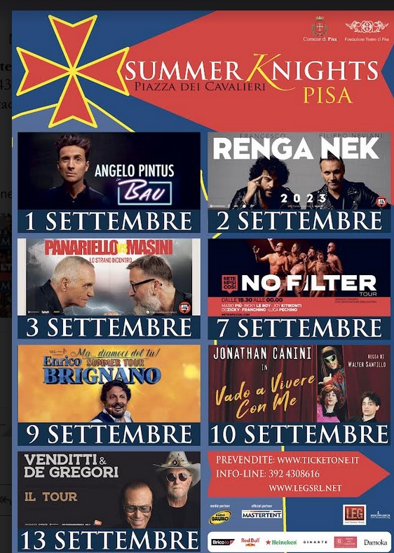 Pisa, 3 agosto 2023. Torna anche quest’anno il “Summer Knights Pisa” in piazza dei Cavalieri, il contenitore di appuntamenti culturali e di spettacolo voluto dal Comune di Pisa, assessorato alla cultura, in collaborazione con la Fondazione Teatro Verdi e organizzato dalla LEG Live Emotion Group. Saranno tanti gli artisti che in sette serate, dall’1 al 13 settembre si esibiranno nello splendido scenario di piazza dei Cavalieri.