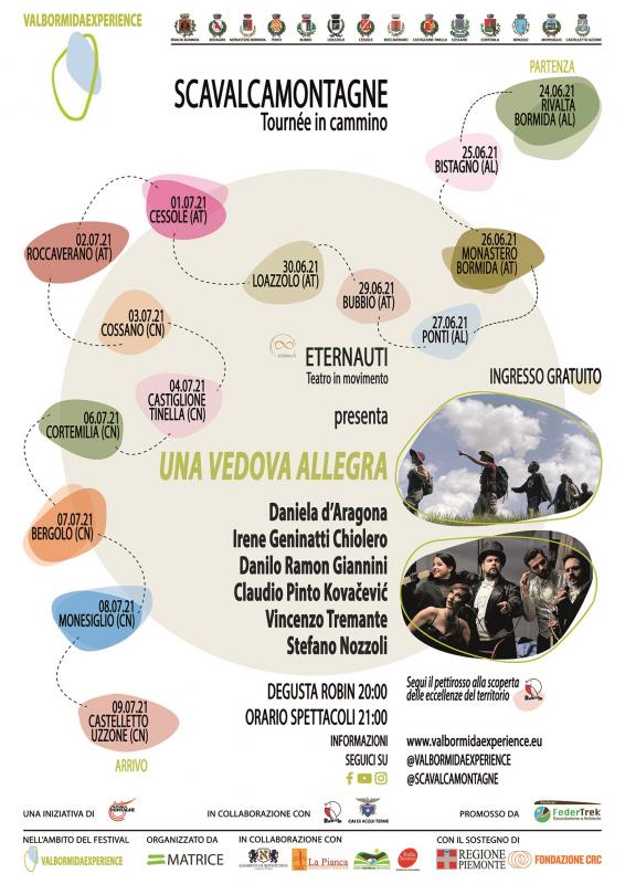 Gli “Scavalcamontagne” sono artisti professionisti che propongono una sorprendente espressione artistica, uno spettacolo dal vivo portato di paese in paese attraverso una tournée realizzata interamente a piedi, zaino in spalla. La pandemia ha cancellato moltissimi eventi dal vivo e per per le piccole comunità organizzare momenti spensierati è alquanto problematico: e allora perché non arrivare sulle piazze e recitare, cantare, ballare portando gioia e un pizzico di serenità? Arrivarci non in auto o con altri mezzi, ma scavalcando colline e montagne: a piedi!!!. Un modo divertente per promuovere territori e sapori attraverso una cultura slow. Paese dopo paese, giorno dopo giorno, al termine di una lunga scarpinata tra campi e boschi; magari in compagnia di chi vuole seguirli non solo in scena ma anche in cammino.