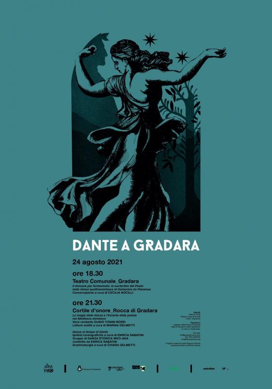 Alle 21:30 nel Cortile d'onore della Rocca di Gradara “La magia della danza e l’incanto della poesia nel Medioevo dantesco”, spettacolo di letture e danze medievali di Marina Gelmetti, Enrica Sabatini e Chiara Gelmetti. Voce recitante Guido Tonini Bossi, flautista e attore, per anni nell’orchestra Nazionale della RAI dove è stato diretto da Muti, Abbado, Temirkanov, Giulini, Maazel, Metha; ha esordito come attore a Venezia nella Biennale Teatro con la regia di Carlo Quartucci e collabora da molti anni col gruppo Viartisti Teatro. In programma letture scelte a cura di Marina Gelmetti, tratte da brani danteschi e di autori coevi: canzone di Guido Guinizelli “Al cor gentil rempaira sempre amore”, ballata di Guido Cavalcanti “Perch’i’ no spero di tornar giammai”, sonetto di Dante “Guido, i’ vorrei che tu e Lapo ed io”, dalla “Divina Commedia”, Purgatorio, il Paradiso Terrestre dal canto XXVIII e Paradiso Celeste dai canti VII, VIII, XII, XXXI. Il gruppo di danza storica WKO-ADA condotto da Enrica Sabatini propone una coreografia di Danze al tempo di Dante, ipotesi ricostruttiva a cura di Enrica Sabatini, danzatrice, performer e musicista pesarese, specializzata nell’esecuzione storicamente informata del repertorio musicale barocco e del repertorio coreutico medioevale e rinascimentale. Drammaturgia a cura di Chiara Gelmetti, fondatrice di A.D.A. Associazione Danze Antiche e attualmente Vicepresidente vicario di WKO-ADA.