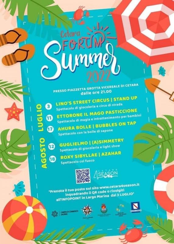 Fino al prossimo mese di agosto, per il ciclo Le Notti Azzurre a Cetara, saranno gli appuntamenti del Forum Summer 2022 ad accompagnare l’estate di bambini e famiglie, a ingresso totalmente libero. Ideata dall’associazione Amici del Forum dei Giovani e dal Forum dei Giovani di Cetara, grazie al patrocinio di Regione Campania e Camera di Commercio Salerno, nel promuovere la partecipazione agli eventi culturali per tutti i gusti: dal magic world alla musica live, fino ai talk, riservando un occhio particolare al divertimento dei più piccoli, la rassegna propone una serie di spettacoli di magia e intrattenimento che accoglierà artisti di strada, circensi e giocolieri, insieme ai fireworks, bubble e light show, nei giorni 11, 17 luglio e 12,18 agosto, a partire dalle 21, in Piazzale Grotta. E ancora, la sera del 18 luglio, sempre alle 21, in Piazza Santa Maria di Costantinopoli, spazio agli eventi dedicati alla musica folk-popolare, da sempre momento di attrazione anche per vacanzieri e turisti che amano fare del loro viaggio una vera e propria esperienza immersiva nella tradizione del borgo costiero. Dal 13 al 15 luglio, si ritorna sul palco allestito nella piazza della Torre Vicereale che ospita, alle 20, la sedicesima edizione della Festa del Libro in Mediterraneo, il salotto letterario di ..incostieraamalfitana.it, per la direzione artistica e organizzativa di Alfonso Bottone, in collaborazione con il Comune e la Pro Loco Cetara.
