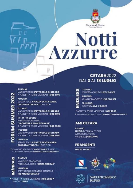 Con il patrocinio di Regione Campania e Camera di Commercio Salerno, il Comune di Cetara riparte con il cartellone Le Notti Azzurre, presentando una serie di appuntamenti per tutti i gusti che accompagneranno l'estate costiera.