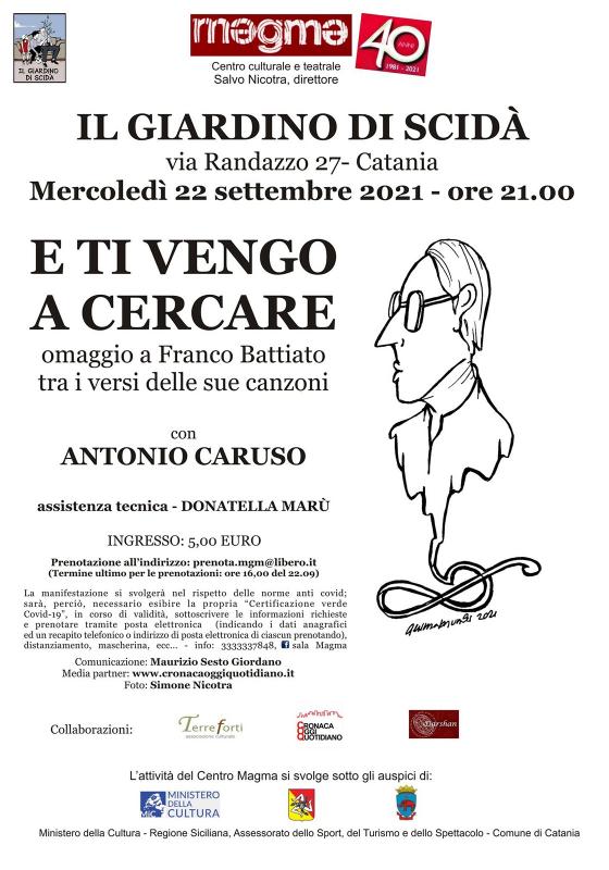 Il Centro culturale e teatrale Magma, diretto da Salvo Nicotra, nell’ambito della programmazione estiva, presenta domani, mercoledì 22 settembre alle ore 21.00 al Giardino Scidà, in via Randazzo 27, a Catania, “E ti vengo a cercare”, omaggio al cantautore, compositore, musicista Franco Battiato tra i versi delle sue canzoni, con Antonio Caruso. Assistenza tecnica di Donatella Marù.