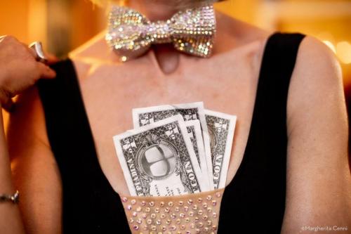 “Sicuramente la parte del “pre-show” quando passiamo tra i tavoli per distribuire le cartelle ed i “buttcoin”! Il pubblico letteralmente impazzisce durante questa fase dello spettacolo. La sensualità del burlesque viene “estremizzata” con lo scopo di crearne una vera e propria macchietta ironica. In più di una occasione mi sono ritrovata a gattonare sui tavoli tra i sorrisi e le risate del pubblico! Leggerezza ed ironia sono le parole d’ordine per questo show! I buttcoin sono una idea che ho avuto per spiegare al pubblico la tipica usanza americana del “tipping”, ovvero del lancio delle banconote sul palco in segno di apprezzamento. Nella nostra cultura è una usanza poco conosciuta e spesso fraintesa, ma grazie al burlesque bingo il pubblico ne viene a conoscenza e se ne innamora all’istante!”.