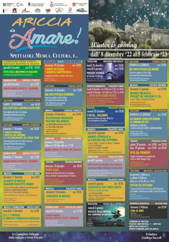 Ariccia si prepara a vivere al meglio il periodo natalizio e i primi mesi del nuovo anno con la versione invernale della kermesse “Ariccia da Amare” con un ricco cartellone di eventi. Si parte domani, 8 dicembre, con le celebrazioni per la festa della Madonna di Galloro per terminare domenica 5 febbraio con una cena al buio nella splendida cornice di Palazzo Chigi. Anche quest’inverno quindi, la Città si animerà con appuntamenti culturali, musicali, teatrali, sociali in grado di regalare ai cittadini e agli ospiti momenti di svago e divertimento. Numerose le associazioni coinvolte nel programma che hanno permesso all’Amministrazione Comunale presentare un programma denso e variegato per grand e piccoli.