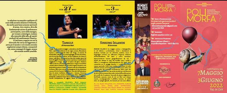 La Terra, le sue meraviglie e le sue malattie sono infatti il nucleo di Polimorfa 2022, che prosegue il 13 maggio alle ore 21 con la compagnia toscana La Ribalta Teatro, che presenta “Settimo Continente”, ironica riflessione sull’inquinamento ambientale di cui l’uomo è responsabile. Per i più piccoli, invece, domenica 15 maggio alle ore 16 il collettivo nomade Ortika è ospite con “Orsòla e il pesciolino d’oro”, un poetico racconto sull’accogliere “l’altro da sé” affidato al linguaggio immaginifico delle marionette. Si prosegue con il teatro di narrazione di Teatro degli Acerbi, che il 22 maggio alle ore 16 accompagnerà il pubblico in una riflessione sul coltivare come scelta di vita con “Il testamento dell’ortolano”. Il 27 maggio alle 21, una novità per Polimorfa, che aggiunge il nouveau cirque tra i linguaggi che propone al suo pubblico: sarà infatti ospite la giocoliera Francesca Mari con il suo “Tangle”, una riflessione interculturale a partire dalle ricerche dell’artista emiliana in Polinesia. Anche la musica è ospite a Polimorfa, che si conclude il 3 giugno alle ore 21 con il concerto performativo “Sinking Island” della band eporediese Satoyama, che riflette sull’innalzamento delle acque e la conseguente scomparsa delle isole.