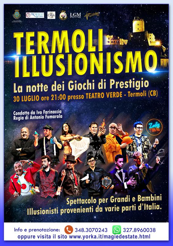 Termoli, 30 luglio ore 21:00 presso il Teatro Verde Termoli, "Termoli Illusionismo", dove una serie di illusionisti e prestigiatori provenienti da varie parti d'Italia si esibiranno con i loro giochi di prestigio per la gioia di grandi e bambini. Da un'idea di Fortunato Fumarola (in arte Magico YorKa), condurrà Ivo Farinaccia (colonna portante dello show con classe ed esperienza), con la regia di Antonio Fumarola (esperienze internazionali messe a disposizione per lo show del 30 luglio), la collaborazione della Pro Loco Termoli, il patrocinio del Comune di Termoli (ass Michele Barile), la partecipazione della Lgm Prodaction, del Club Magico Molisano e il Club Magico Abruzzese si esibiranno per voi: