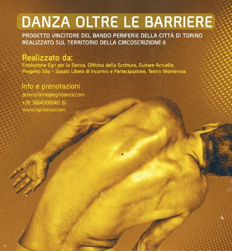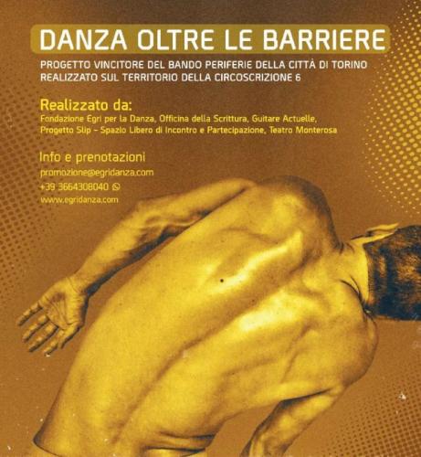 DANZA OLTRE LE BARRIERE è il nuovo progetto, realizzato da Fondazione Egri per la Danza, Officina della Scrittura, Guitare Actuelle, Progetto Slip - Spazio Libero di Incontro e Partecipazione, Teatro Monterosa, che sintetizza e sviluppa una serie di azioni già intraprese in precedenza dalla Fondazione Egri per la Danza, in alcuni spazi della Circoscrizione 6 di Torino e realizzate grazie anche alla collaborazione con alcuni enti del territorio quali Officina della Scrittura e Comitato Civico di Barca e Bertolla.
