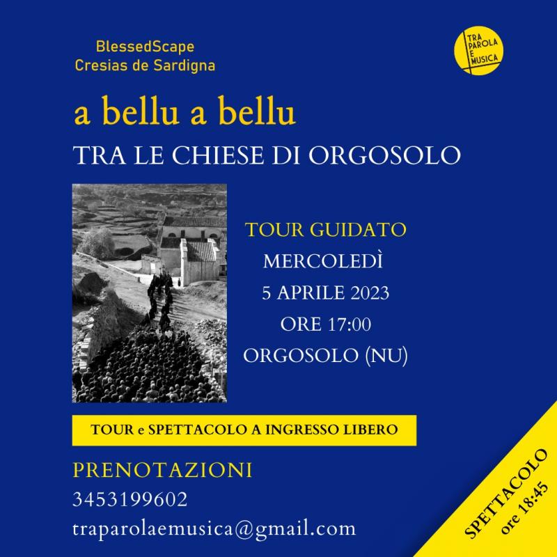 A BELLU A BELLU - Tra le Chiese di Orgosolo - Prima dello spettacolo si svolgerà un tour guidato tra le chiese più importanti di Orgosolo ripercorrendo le tracce della Beata Antonia Mesina. Il percorso sarà a cura delle guide Antonio Musina e Alessandro Cubeddu, operatori impegnati nella valorizzazione del patrimonio religioso e culturale e partirà alle ore 17:00 da Piazza Don Graziano Muntoni
