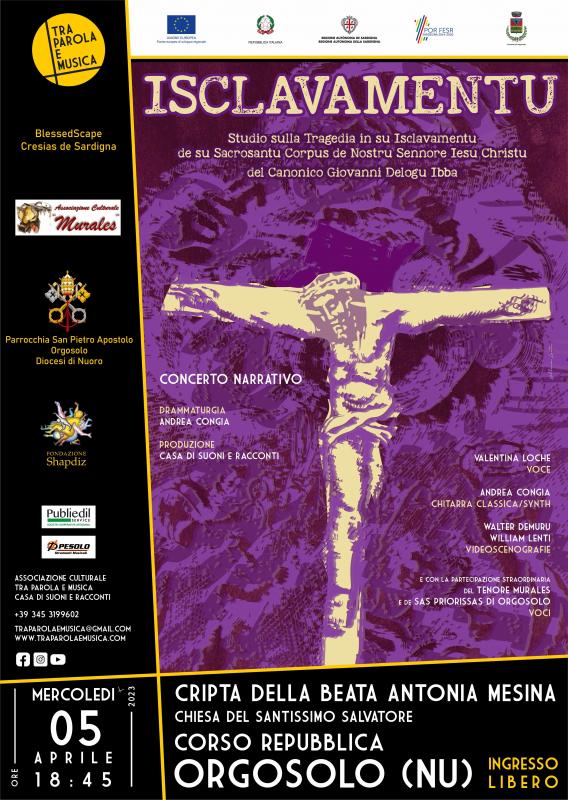 ISCLAVAMENTU - Prossimo appuntamento per la Casa di Suoni e Racconti nel cuore della Barbagia, ad Orgosolo, Mercoledì 5 Aprile con Isclavamentu, uno studio multiartistico tratto dal testo “Tragedia in su Isclavamentu” del Canonico Giovanni Delogu Ibba. L’appuntamento è fissato per le ore 18:45 presso la Cripta della Beata Antonia Mesina nella Chiesa del Santissimo Salvatore (Corso Repubblica) che ospiterà la messa in scena del testo settecentesco che racconta la deposizione di Gesù Cristo dalla Croce. In scena l’attrice Valentina Loche e il musicista Andrea Congia con la partecipazione straordinaria del Tenore Murales e de Sas Priorissas di Orgosolo. Parola e Musica prenderanno forma con le videoscenografie realizzate da Walter Demuru, con i contributi degli operatori video Davide Manca (Flymedia) e Fernando Pascual e del grafico William Lenti