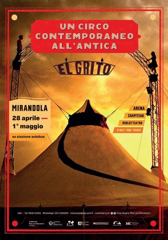 A Mirandola nello chapiteau va in scena - dal 28 al 30 aprile alle ore 21 e lunedì 1° maggio alle ore 18 - Uomo Calamita di Circo El Grito, uno degli spettacoli di punta della compagnia, in cui si intersecano musica, circo, illusionismo e letteratura (sul palco Giacomo Costantini, lo scrittore Wu Ming 2 e il musicista Fabrizio “Cirro” Baioni). Di lato al tendone un’arena a cielo aperto, con gradinate che ospitano 190 persone, dove vengono presentati alle ore 18 la Compagnia Rasoterra con lo spettacolo Happiness (28 aprile) e Humberto Kalambres con il suo El Aletreo (29 e 30 aprile). E poi un progetto speciale nello scrigno di una roulotte-teatro per uno spettacolo intimo di 15 minuti, dedicato solo a 7 spettatori alla volta, 4 repliche ogni giorno (dalle ore 17 alle ore 20), in cui la Compagnia Samovar presenta Officina Oceanografica Sentimentale (dal 28 al 30 aprile).