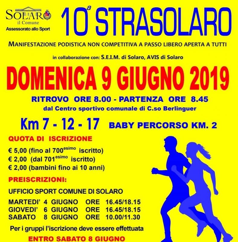 La 10^ edizione della Strasolaro, la manifestazione podistica non competitiva a passo libero aperta a tutti si svolgerà domenica 9 giugno 2019.