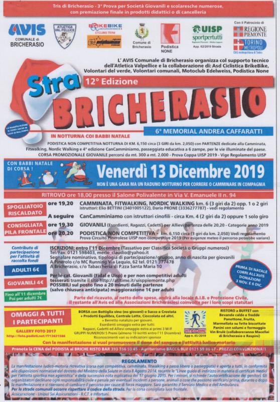 Venerdì 13 Dicembre torna la StraBricherasio, un originale momento podistico in notturna con i Babbi Natale con la 12^ edizione, 6° edizione memorial Andrea Caffaratti, confermando l’esclusiva vocazione di manifestazione podistica in notturna chiama a raccolta i runners e walkers del pinerolese e non solo, possibilmente addobbati da babbi Natale, per contribuire a creare una festosa atmosfera che sappia coinvolgere il variegato mondo podistico in imminenza delle prossime festività. Sarà anche valida quale 3° prova del circuito “Tris di Bricherasio” per Società giovanili e scolaresche numerose riservata ad atleti sino a 17 anni con premiazione finale in prodotti didattici o cancelleria. Viene organizzata dalla Sezione Avis di Bricherasio con il supporto tecnico dell’Atletica Val Pellice e la collaborazione di: Asd Ciclistica Brike Bike,Volontari del verde, Volontari comunali, Motoclub Edelweiss e Podistica None. Cuore pulsante della manifestazione rimane il Salone Polivalente sito in Piazza Don Morero dove è fissato il ritrovo per le ore 18. Come da tradizione gli organizzatori hanno allestito prove per ogni genere di attitudine podistica a partire da quella regina, non competitiva, sulla distanza di km 6,150 (3 giri Km 2.050). A seguire la semplice camminata, il Fitwalking, il Nordicwalking (da 1 a 3 giri) e l’originale CanCamminiamo consigliato 1 solo giro.