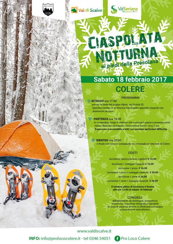 Ritrovo alle ore 17.30 presso la sede degli alpini di Colere in via Tortola 52 e partenza ore 18.30 circa.