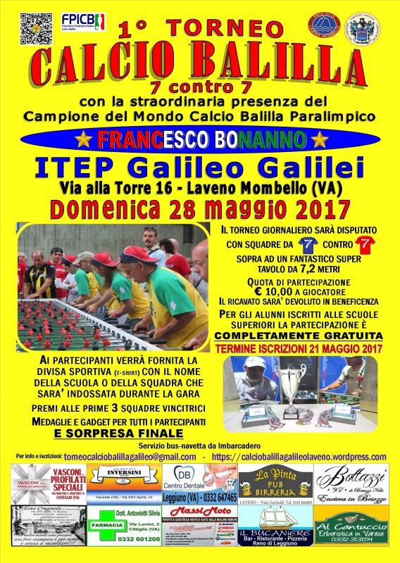 L’Istituto Tecnico Economico Paritario “Galileo Galilei” di Laveno Mombello, situato nella splendida cornice del Lago Maggiore, immerso nel verde e nella tranquillità di un luogo da sempre destinato al culto dello studio, ospiterà un importante progetto no-profit a fini sociali, sportivi ed educativi diretto a tutti coloro che amano socializzare, stare bene assieme e confrontarsi divertendosi. Un programma ideato perché lo sport diventi un diritto di tutti e alleni i ragazzi a crescere più sani e felici, con l’obiettivo di incoraggiarli a svolgere attività fisica, facilitando il loro processo di maturazione e aiutandoli ad acquistare la consapevolezza delle proprie potenzialità. Il progetto si propone di offrire supporto alle famiglie che non possono sostenere i costi dell’attività sportiva extrascolastica, promuovendo stili di vita corretti e salutari, insieme ai valori educativi dello sport, come lo spirito di gruppo e l’integrazione sociale.Come primo evento in programma, in data 28 maggio 2017 si terrà dunque, con il patrocinio della “Federazione Paralimpica Italiana Calcio Balilla” e dei suoi campioni, un torneo giornaliero di Calcio Balilla con squadre da 7 contro 7 disputato su un fantastico super tavolo da 7,2 metri. L'iscrizione al torneo è aperta a persone che abbiano compiuto almeno 14 anni di età, indifferentemente da sesso o disabilità.La partecipazione per gli studenti regolarmente iscritti ad una scuola superiore è completamente gratuita, mentre a tutti gli altri partecipanti verrà richiesto un contributo spese di euro 10,00 a giocatore ed il ricavato sarà devoluto in beneficenza.