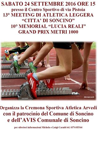 Sabato 24 settembre 2016, presso Centro Sportivo di Via Pistoia, si svolge il 13° Meeting Atletica Leggera "Citta' Di Soncino", 10° Memorial "Lucia Reali" con gare valide per il Grand Prix dei Metri 1.000.