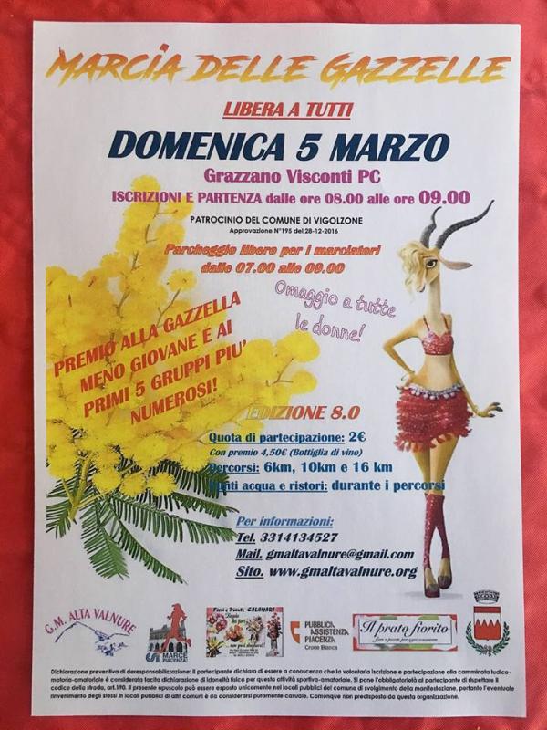Domenica 5 Marzo si svolge a Grazzano Visconti l'8^ edizione della Marcia Delle Gazzelle, marcia non competitiva riservata alle donne.