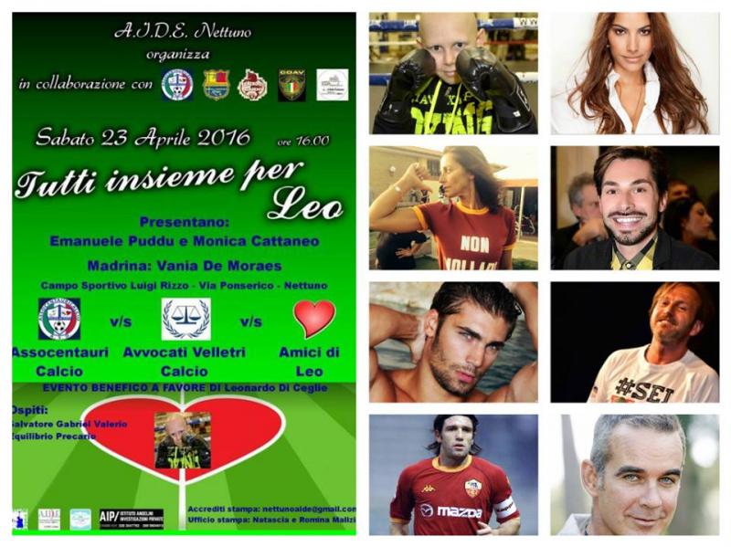 Tutti insieme per Leo! La partita del cuore si disputerà a Nettuno tra vip ed ex calciatori Vs “forze dell’ordine” ed avvocati. L’iniziativa spontanea nasce dall’associazione Aide di Nettuno, in collaborazione con altre associazioni locali per la raccolta di fondi a favore di Leonardo Di Ceglie. Leonardo è un ragazzino di 12 anni bellissimo, forte e tenace, affetto da un grave cancro che aggredisce le ossa ed i tessuti molli circostanti, il sarcoma di Ewing. La partita del cuore “Tutti insieme per Leo” ha lo scopo principale di raccogliere fondi, per il delicato intervento che Leonardo dovrà affrontare nel mese di aprile e per le successive cure sperimentali. Il devoluto dell’iniziativa andrà ai genitori di Leonardo. Il conto alla rovescia è partito e la data da ricordare per partecipare uniti ed impegnati per Leonardo, è sabato 23 aprile 2016, dalle ore 16presso il Campo Sportivo “Luigi Rizzo” Cretarossa – Nettuno (Rm). Protagoniste tre squadre di calcio: “Amici di Leo”, l’Associazione “Assocentauri” della Polizia di Stato e “Avvocati Velletri Calcio”.