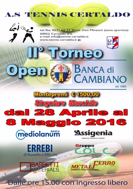 CERTALDO (FI) – Si svolgerà dal 28 aprile al 8 maggio 2016, nell'area di via don Minzoni, la seconda edizione del Torneo Open – Trofeo Banca di Cambiano, singolare maschile su terra rossa, organizzato dall'Associazione Tennis Certaldo in concomitanza. Parteciperanno atleti di calibro nazionale come Matteo Trevisan (già categoria 1.13 e numero 220 del ranking internazionale ATP nel 2015, oggi seconda categoria), Leonardo Azzaro e Davide Della Tommasina, ma anche la speranza certaldese Gianluca Acquaroli (seconda categoria, 2.3). L'iniziativa è stata presentata stamani dal presidente dell'Associazione Tennis, Mauro Crocetti e dall'assessore allo sport del Comune di Certaldo, Jacopo Arrigoni.