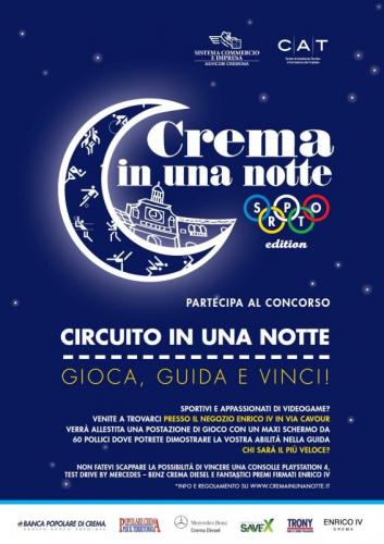Immancabile come sempre il concorso. Per questa edizione Banca Popolare di Crema, associazione Popolare Crema per il Territorio, Enrico IV, Trony, Savex hanno allestito il concorso Circuito in una notte. Per tutti gli sportivi e appassionati di videogame, e per i più nerd, verrà allestita una postazione di gioco con un maxi schermo da 60 pollici dove giocare e dimostrare le abilità nella guida. Fantastici i premi, una consolle playstation 4 offerta da Trony, test drive Mercedes – Benz Crema Diesel e fantastici premi firmati Enrico IV.