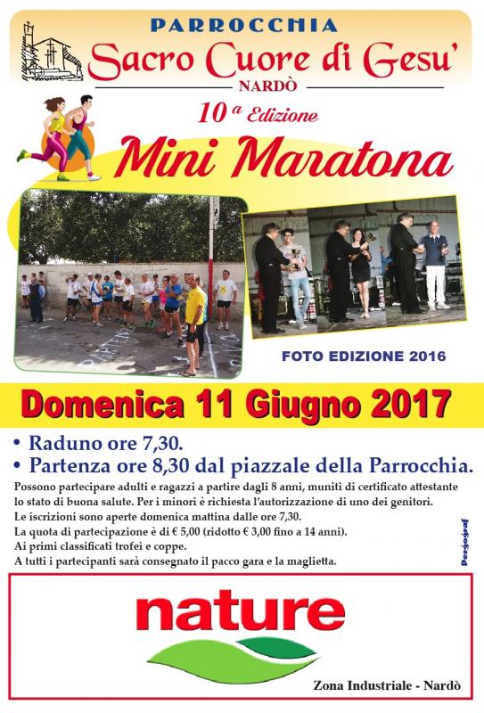 Domenica 11 giugno a partire dalle 8.30 dal piazzale della parrocchia Sacro Cuore di Gesù di Nardò si svolgerà decima edizione della mini-maratona, gara podistica aperta a tutti, adulti e ragazzi, a partire dagli otto anni d'età purché muniti di un certificato attestante lo stato di buona salute. Per i minorenni, invece, è richiesta l'autorizzazione scritta di uno dei genitori.