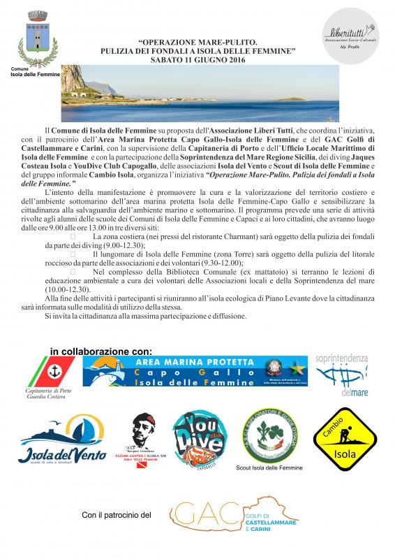 Il Comune di Isola delle Femmine su proposta dell'Associazione Liberi Tutti, che coordina l'iniziativa, con il patrocinio dell'Area Marina Protetta Capo Gallo-Isola delle Femmine e del G.A.C. Golfi di Castellammare e Carini, con la supervisione della Capitaneria di Porto e dell'Ufficio Marittimo Locale di Isola delle Femmine, con la partecipazione della Soprintendenza del Mare Regione Sicilia , dei diving Jacques Costeau Isola e YouDive Club Sferracavallo ,delle associazioni Isola del Vento e Gruppo Scout Isola delle Femmine e del gruppo informale Cambio Isola,