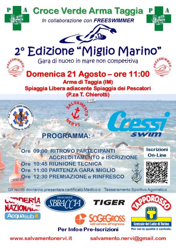 La ASD Freeswimmer, in collborazione con CROCE VERDE ARMA TAGGIA e con il supporto della Soc. Naz. Salvamento Nervi organizza, una manifestazione sportiva con gara di nuoto in mare aperta a tutti sulla distanza del miglio marino (1852mt).