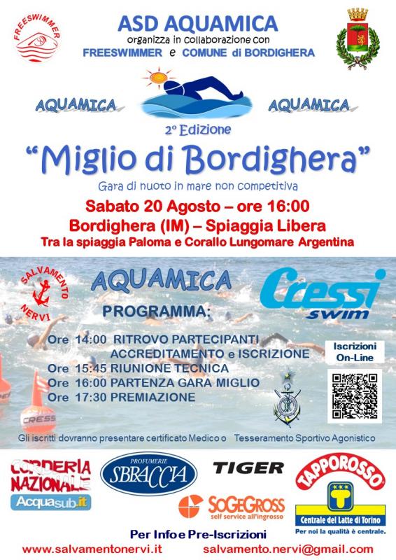 La ASD Freeswimmer, in collborazione con Ass. AQUAMICA e con il supporto della Soc. Naz. Salvamento Nervi organizza, una manifestazione sportiva con gara di nuoto in mare aperta a tutti sulla distanza del miglio marino (1852mt).