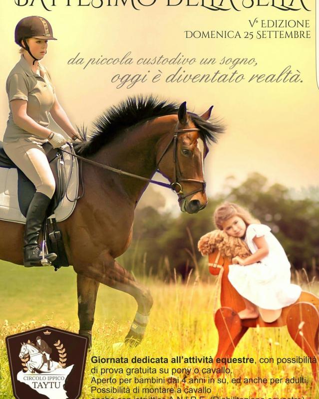 Domenica 25 settembre 2016 si terrà la V° Edizione del "Battesimo della Sella", ovvero la giornata dedicata all’attività equestre, con possibilità di prova gratuita su pony o cavallo.