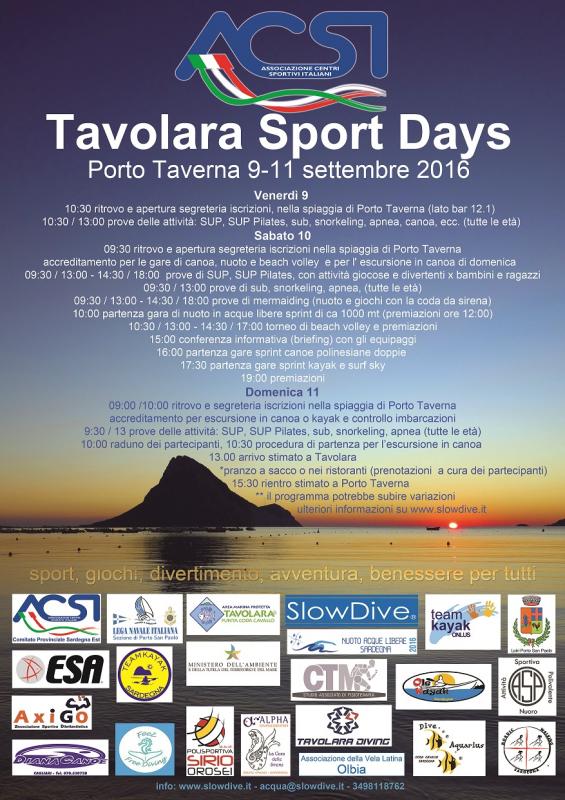 Dal 9 al 11 Settembre Porto Taverna è la location della nuova edizione di Tavolara Sport Days edizione 2016, evento nazionale promosso da ACSI - Associazione di Cultura , Sport e Tempo Libero, attraverso il proprio Comitato Provinciale Sardegna Est e realizzato grazie all'Amministrazione Comunale di Loiri Porto San Paolo con l' organizzazione dall'asd SlowDive, in sinergia con Settore Nazionale ACSI Divisione Sub, Esa e Lega Navale Italiana sez. Porto S. Paolo.