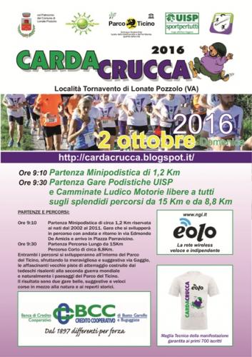 È in programma domenica 2 ottobre a Tornavento di Lonate Pozzolo (Va) l’edizione 2016 della CardaCrucca, gara podistica organizzata dalla Cardatletica ASD di Cardano al Campo con il supporto della Bcc di Busto Garolfo e Buguggiate. Una corsa adatta a tutti che si caratterizza per i tre percorsi previsti e per il territorio interessato: con l’esclusione del tracciato dedicato ai bambini da 1,2 km, i percorsi da 8,8 e 15 km attraversano infatti una sorta di museo all’aperto lungo quelle che erano le piste di atterraggio create dai tedeschi durante il secondo conflitto mondiale arrivando a toccare alcune aree naturali del Parco del Ticino. Il tutto con un arrivo spettacolare nella piazzetta di Tornavento, un vero e proprio balcone affacciato sulla Valle del Ticino, dopo aver costeggiato il canale Villoresi.