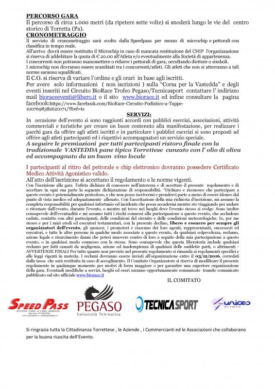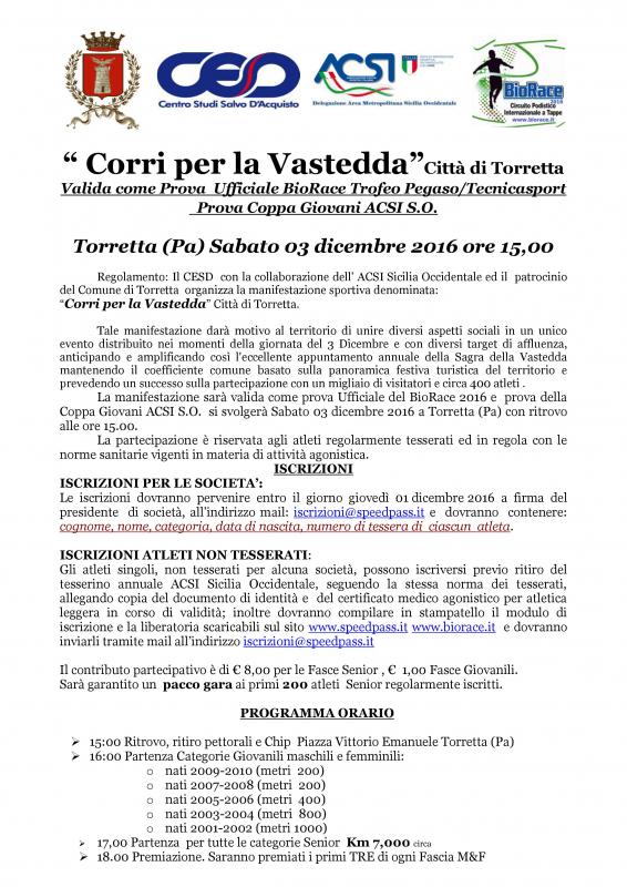 In ambito della manifestazione denominata “Corri per la Vastedda” i girini del BioRace potranno conoscere il caratteristico centro storico della Città di Torretta, una festa sportiva che darà motivo al territorio di unire diversi aspetti sociali in un unico evento distribuito nei momenti della giornata del 03 Dicembre con diversi target di affluenza, anticipando e amplificando così l'eccellente appuntamento annuale della Sagra della Vastedda (in programma per l’8 dicembre p.v.) mantenendo il coefficiente comune basato sulla panoramica turistica del territorio .