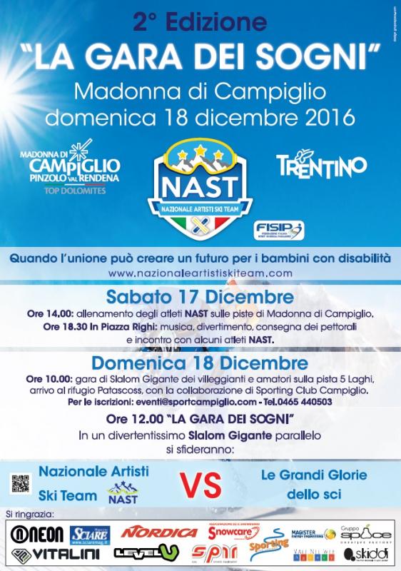 Il programma inizierà sabato 17 dicembre, alle 14.00, con l’allenamento degli atleti Nast sulle piste di Madonna di Campiglio. Poi, alle 18.00, festa con brindisi in piazza Righi, estrazione dei pettorali di gara, incontro con alcuni atleti-artisti. Presenterà e canterà Giovanni Danieli, noto artista Trentino grande collaboratore dei Pooh, ci sarà la grande Voce di Miza Mayi, collaboratrice di Zucchero con partecipazione a diversi show di Chiambretti, e accompagnamento al sax di Jessica Cochis con d j set, o spite anche il cantautore Luca Bretta.