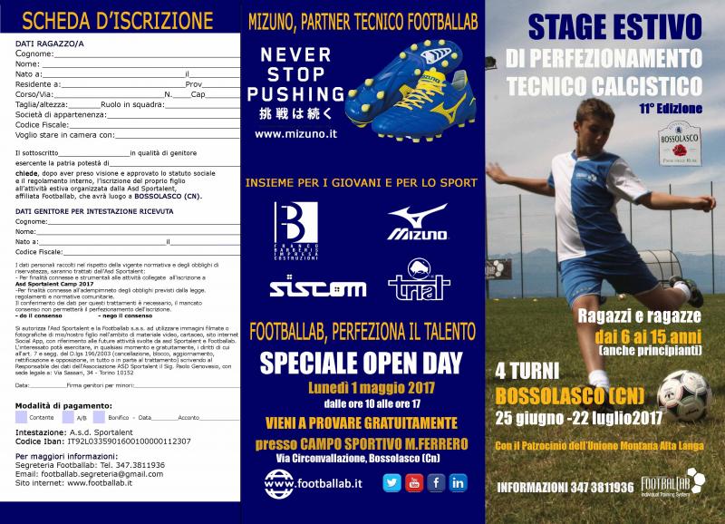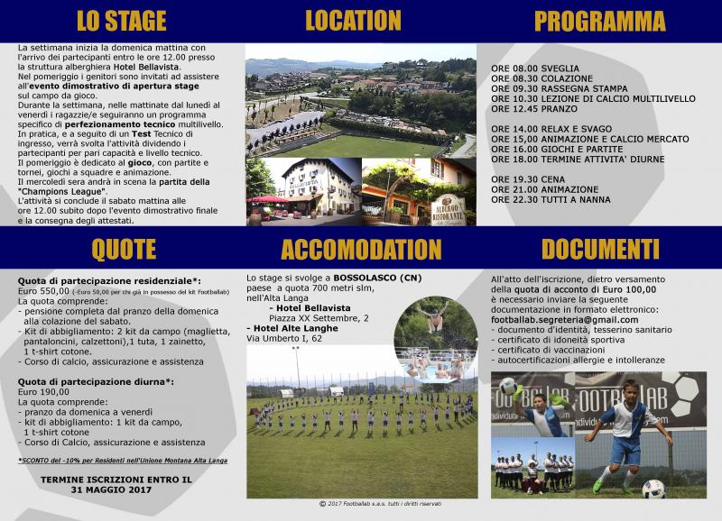 Abbiamo il piacere di presentarvi l’undicesima edizione del Summer Camp di Footballab che si terrà a BOSSOLASCO (CN), con quattro turni multilivello, a partire dal 25 giugno fino al 22 luglio 2017. Il Camp è strutturato con lezioni di perfezionamento tecnico calcistico tenute da istruttori altamente qualificati, le cui sessioni di allenamento prevedono un massimo di quattro/cinque allievi per insegnante. Al Summer Camp possono iscriversi bambini e bambine dai 6 ai 15 anni di età, anche principianti. Da quest’anno, tutti i residenti dei 38 paesi facenti parte dell’Unione Montana Alta Langa, che patrocina il progetto, avranno la possibilità di ricevere uno sconto del 10% all’atto di iscrizione.