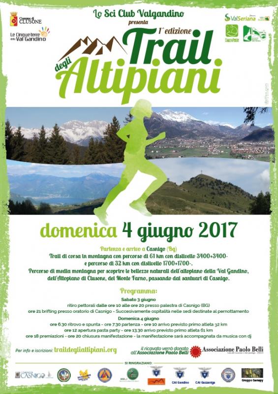 Domenica 4 giugno 2017 prenderà il via la prima edizione del TRAIL DEGLI ALTIPIANI, una durissima corsa in montagna suddivisa in due categorie e organizzata dallo Sci Club Valgandino.