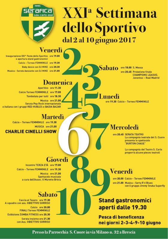 Brescia.Venerdì 2 giugno prende il via la XXI^Settimana dello Sportivo alla Parrocchia S.Cuore in via Milano 32 che per 9 giorni vedrà il susseguirsi di piacevoli serate all’insegna dello sport e dello spettacolo, senza far mancare lo spazio dedicato al gusto con stuzzicanti proposte di street food. Tutte le proposte sono ad ingresso libero senza prenotazione.