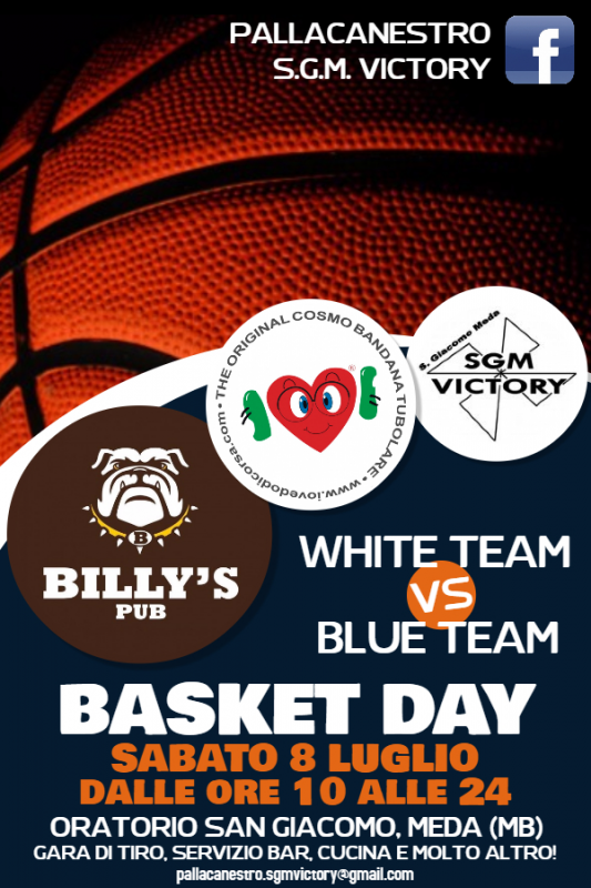 L'evento si svolgerà SABATO 8 LUGLIO dalle ore 10:00 alle ore 24:00 presso l'Oratorio San Giacomo di Meda (MB) e vedrà impegnate più squadre che si sfideranno in un appassionante TORNEO all'insegna del puro divertimento e della sfrenata passione per quello che è lo sport più bello del mondo, la PALLACANESTRO. Le squadre partecipanti saranno suddivise in WHITE TEAM e BLUE TEAM. Inoltre durante la manifestazione si disputerà una GARA di TIRO e si susseguiranno fino allafine tantissime sorprese, ma non possiamo svelarvi altro!