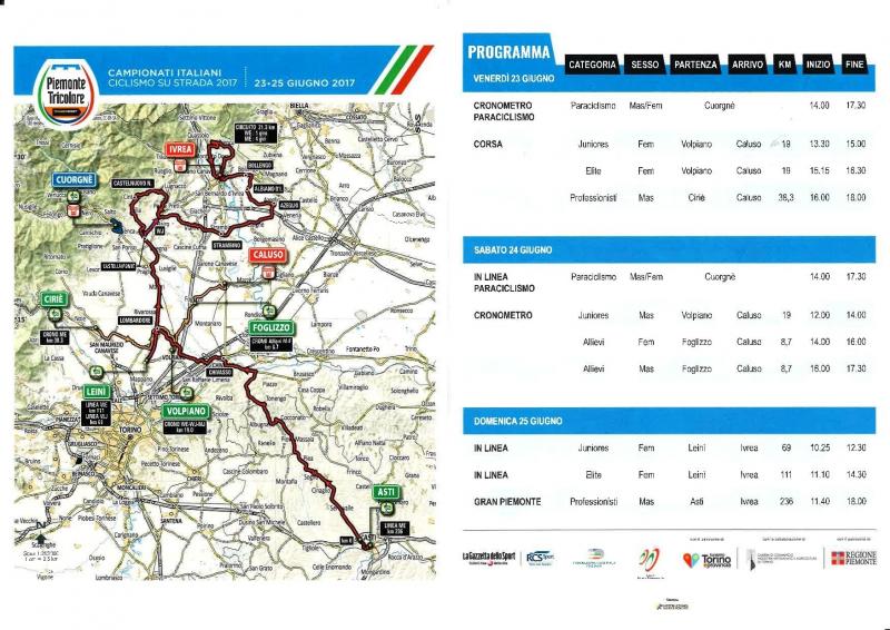 “Piemonte Tricolore”, la manifestazione ciclistica nazionale valevole come Campionati Nazionali Italiani 2017 che porterà sulle strade piemontesi circa 700 atleti, al 23 al 25 giugno 2017, coinvolgerà Cirié venerdì 23 giugno, con la partenza della Cronometro Uomini Elite Cirié Caluso, da Corso Martiri della Libertà, tra le 16 e le 18.