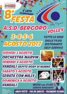 L’A.S.D. Bergoro Volley, in collaborazione con la Pro Loco Fagnano Olona, organizza l’8° Festa del Bergoro Volley, dal 3 al 6 agosto 2017, presso l’Area festa di via De Amicis a Fagnano.