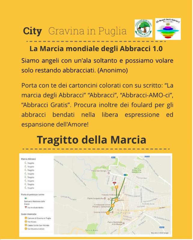 In un’epoca in cui si è soliti comunicare quasi unicamente con gli smartphone e si esprimono emozioni con le emoticons rinunciando al dialogo vis-à-vis ed al contatto diretto, la giornalista Emanuela Grassi - membro del movimento Abbracci Gratis Italia-Free Hugs e dell’associazione Gli Angeli degli abbracci - ha scelto di diventare Referente per la propria città natia, Gravina in Puglia, della MARCIA MONDIALE DEGLI ABBRACCI 1.0, marcia che avrà luogo il 16 settembre 2018 a livello mondiale in oltre 80 città, anche italiane, tra cui per l’appunto la città del grano e del vino.