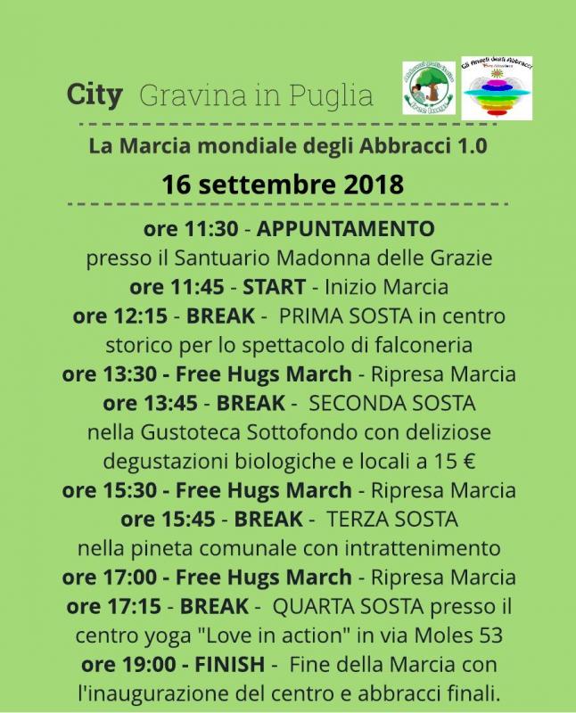 A Gravina in Puglia, l’appuntamento è alle ore 11.30 presso il Santuario Madonna delle Grazie, il cui Parroco Don Giovanni Bruno ed il Vice-Parroco Don Giuseppe Loizzo, sposando a pieno l’iniziativa, inviteranno i partecipanti alla funzione domenicale a dare avvio al percorso di gioia e amore che inizierà con l’abbraccio a fine messa donato dal gruppo di abbracciatori che avranno i cartelli “Abbracci_Amo_ci” – “Abbracci Gratis” – “Regalo Abbracci” – “Free Huggers” – “Abbracci liberi”. La marcia proseguirà lungo C.so Aldo Moro fino a giungere alle porte di Palazzo di città dove una delegazione dell’amministrazione rappresentata dall’Assessore al Turismo Raffaele Lorusso si unirà alla marcia per raggiungere il centro storico percorrendo Via Museo, dove incontreranno lo spirito del barone Ettore Pomarici Santomasi; per poi arrivare nel centro storico dove avrà luogo lo spettacolo di falconeria a cura del Centro studi Nundinae, che il 15 e 16 settembre darà vita al Raduno dei cortei storici medievali.