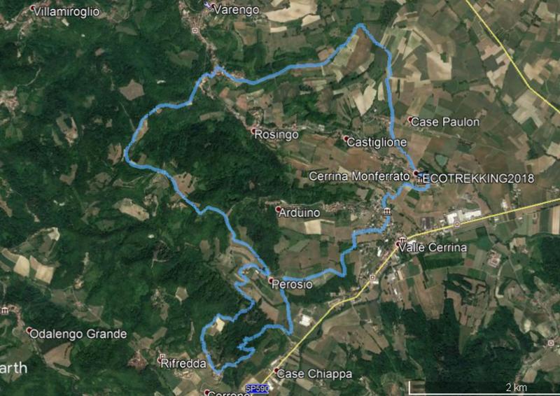 Dopo la partenza il percorso prevede di dirigersi verso il piccolo borgo di Case Bolli prima in discesa e poi in salita fino alla cappelletta di San Luigi per poi ridiscendere in aperta campagna tra prati e campi e seguire quindi fino alla località Borgatello di Varengo. Usciti dall’abitato si segue una strada bianca che in leggera salita porta in una zona boscosa e molto panoramica per poi ridiscendere verso la borgata di Perosio, dove lungo il sentiero sarà possibile rifocillarsi in une delle stazioni di ristoro previste lungo il percorso. Si prosegue quindi fino a fondovalle per poi prendere una ripida salita che porta in frazione Montalero di Cerrina. Qui abbandoniamo la strada seguita dai podisti dell’Ecomaratona per ritornare verso Perosio e scendere quindi verso la frazione di Valle Cerrina. Da qui un susseguirsi di brevi salitelle porterà il gruppo di camminatori verso il capoluogo Cerrina dove avranno fine le fatiche degli escursionisti.