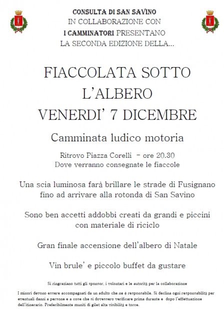 Venerdì 7 dicembre alle 20.30 ci sarà la seconda edizione della “Fiaccolata sotto l’albero”, la camminata ludico motoria organizzata dalla Consulta di San Savino.