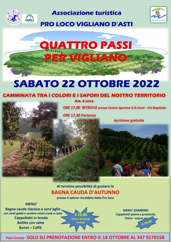Camminata tra i colori e i saporti del nostro territorio - km 8 circa. Al termine possibilità di gustare la Gran Bagna cauda d'autunno preparata dalla Pro loco di Vigliano d'Asti