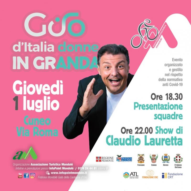 Giovedì 1 luglio, alle ore 18,00, sul palco di via Roma a Cuneo, la presentazione delle 24 squadre iscritte alla corsa, tra cui le 9 dell'UCI Women's World Team. Alle ore 22, sullo stesso palco, spettacolo dell'imitatore Claudio Lauretta, ad ingresso libero nel rispetto della normativa anticontagio. A Cuneo, l'amato showman italiano porterà lo spettacolo "Imitamorfosi", pièce esilarante e mai banale nella quale Lauretta riesce a dare il meglio di sé, trasformandosi ora in politico ora in personaggio pubblico del momento.