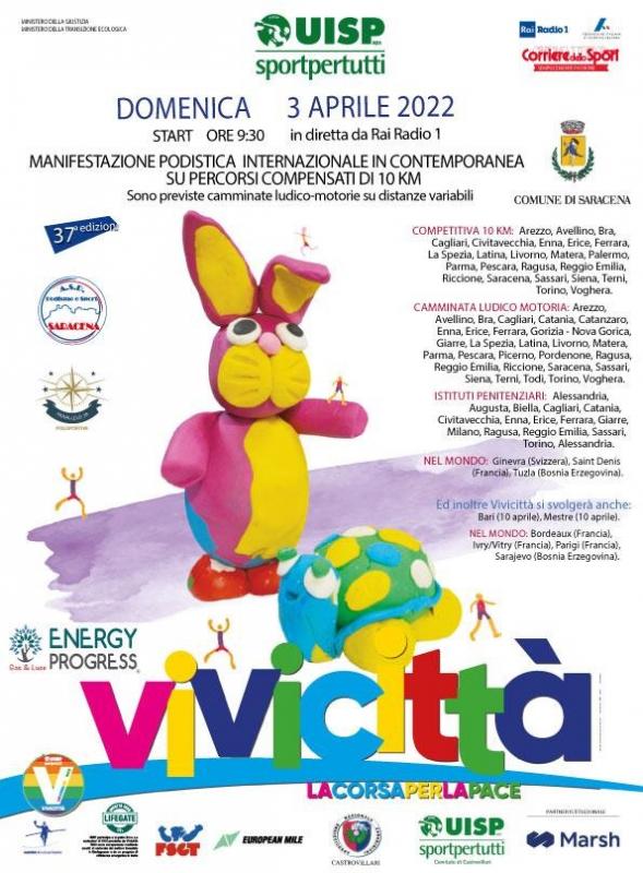 Quest'anno l'Uisp dunque, ci riprova, con tanto entusiasmo e con un lotto di decine di coraggiosi Comitati Uisp che si mettono alla prova proprio puntando su Vivicittà. Un coraggio condiviso con i partners che sostengono Vivicittà, a cominciare da Marsh, broker assicurativo, che è rimasto accanto all'Uisp anche nei mesi più difficili della pandemia, cercando di mettere al servizio dei praticanti polizze assicurative su misura. Ci sono poi i media partner, storici amici di Vivicittà sin dalla prima edizione: si tratta del Corriere delloSport e di Radio 1 Rai che anche quest'anno darà la partenza in diretta alle 9.30 di domenica 3 aprile. Ricordiamo poi la vicinanza della Fidal, altro partner storico della corsa Uisp, insieme ai partner green, come Lifegate e Agenda 21, oltre alla Fsgt, associazione di sport per tutti francesce. Le manifestazioni Uisp sono da sempre un veicolo di solidarietà e di pace, ed in particolare Vivicittà è stata per anni dedicata alla pace, si è svolta a Baghdad, a Sarajevo, a Beirut, a Gerusalemme Est. Nel 2022, poco dopo l'inizio dei bombardamenti, si è scelto di reinserire questo messaggio, esplicitandolo su tutti i materiali i grafici di Vivicittà e di Giocagin. E così, la colorata e allegra grafica prevista quest'anno, sarà accompagnata dai 7 colori dell'arcobaleno, con meno allegria, ma con la speranza di portare per l'Italia questo messaggio universale.