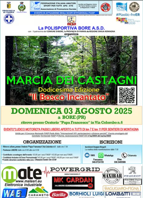Evento "Ludico Motorio" su strade di montagna inserito nel circuito provinciale FIASP di Parma.Vengono proposti 2 circuiti da 7 e 11km che attraversano i secolari castagneti che circondano Bore (PR)Si svolge a Bore domenica 03 agosto 2025 Sono però richieste scarpe da trekking e abbigliamento idoneo.