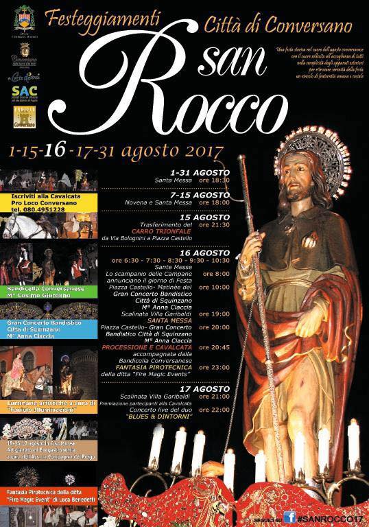 Il 16 agosto si svolge la secolare cavalcata e processione di San Rocco, patrono di Conversano e potente protettore dalla peste, ma gli eventi per i festeggiamenti del Santo iniziano il 1° di agosto e terminano il 31 di agosto, seguendo il programma riportato nella locandina.