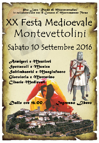 La XX Festa Medioevale a Montevettolini (Pistoia) si svolge sabato 10 settembre 2016.