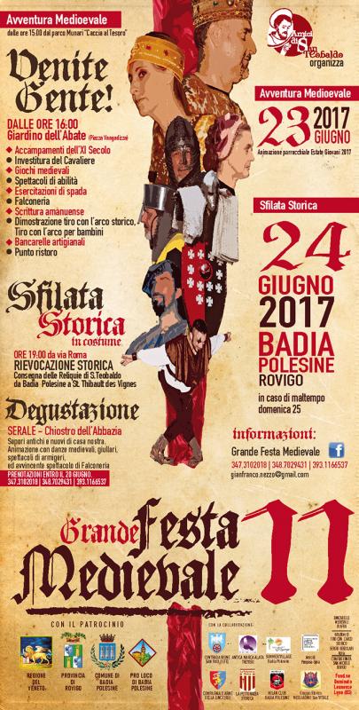 Associazione Amici di S. Teobaldo. con il patrocinio Regione Veneto, Provincia di Rovigo, Comune di Badia Polesine, Pro Loco - Badia Polesine, organizza sabato 24 giugno 2017 la XI Grande Festa Medievale, una giornata di rievocazione storica in onore di San Teobaldo.
